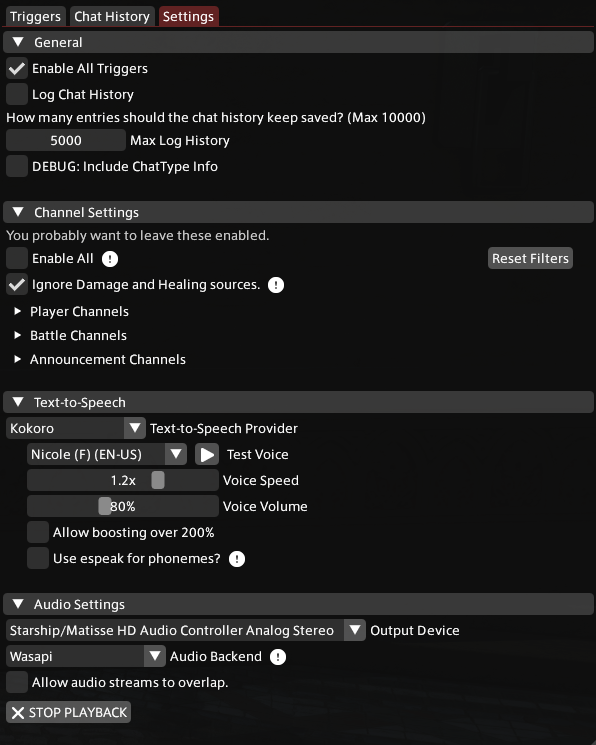 New Triggers can be created by either clicking the "Add" button on the Triggers tab or saving a chat log message on the Chat History tab. Triggers may also be shared and imported using the Import/Export buttons. Chat logging is disabled by default every time the plugin starts, and once enabled you can search for specific messages it has recorded. This may be useful if you're unsure of the exact message you want to create a trigger for but only know some of the words. You can also configure how many messages should be stored at a time. Message history is never saved outside of the plugin running and is lost when the plugin is disabled.