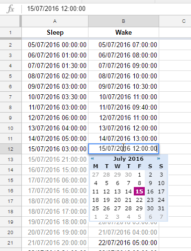I record my sleep and wake times simply on a Google Sheet. There are two columns; "Sleep" and "Wake". Both columns use the Date/time format. To use this data in SleepCharter, I export the sheet to CSV.