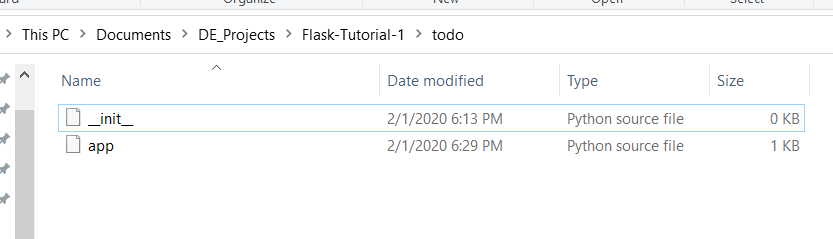 Navigate into the todo folder created from above step. In here, create a blank __init__.py file and app.py file.