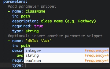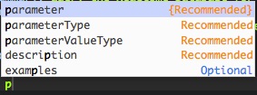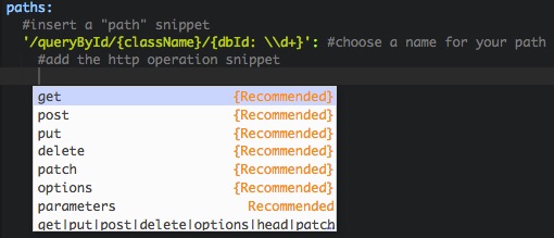 - Add "paths" and add a name for your path, add the operation (e.g. Get, Post, etc.), then add the "parameter" snippet. Add values for the snippet elements. Again, the auto-suggestion functionality is available either by pressing Ctrl-Space (to get all the suggestions) or start typing (to get the matched suggestions).