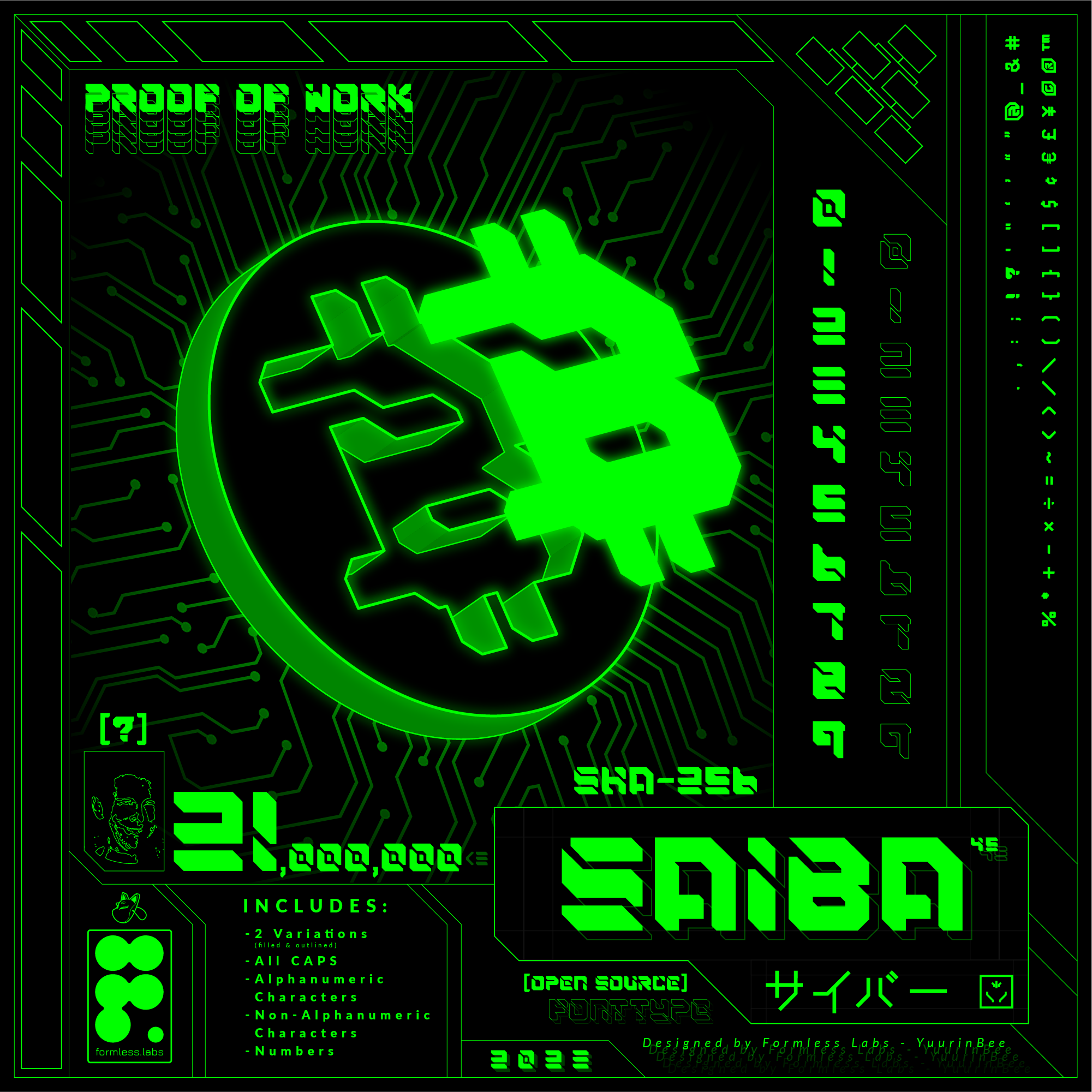 SAIBA-45 is a display font that was inspired by CyberPunk, NeoTokyo, Mecha, Manga/Anime, Retro, Tech, and Futuristic styles. It was intended to be used for short-form and large-format displays, but not limited to this type of application. Efficient ways to experiment with this font are provided in graphic examples below, but include: distinct logotypes, stylized names and text, unique vector characters, bold titles, and more. The name SAIBA was chosen as the "katakazination" (transforming English to Katakana) of the English word "Cyber" to be pronounced with Japanese vowels and syllables. The word cyber translates to サイバー in Japanese, which is pronounced as "Saiba". The 45 in SAIBA-45 is reflective of the 45 degree angles used to create the prominent edges, defining the look and feel of the font. This font has been in development since 2021.