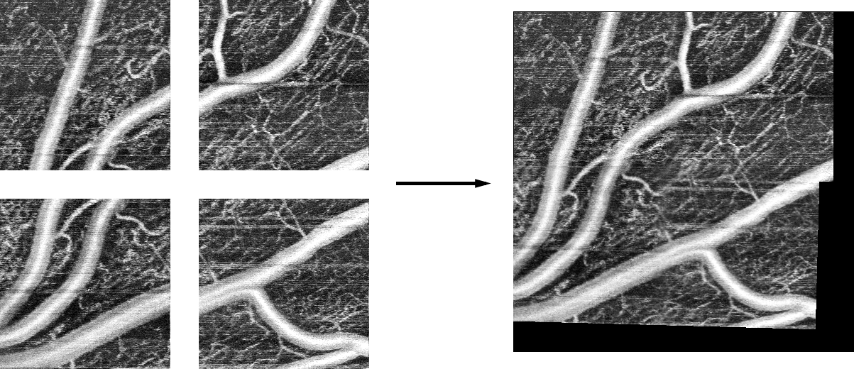 Thesis product is a program called mostitch that automatically stitches set of retinal angiography eye images. Below is an example set of input images and the output of mostitch program.