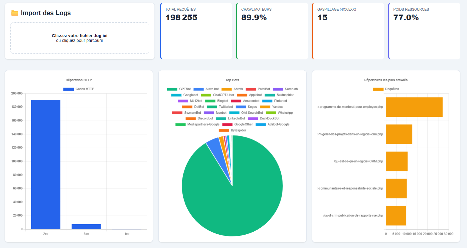 Aucune installation, aucun serveur, aucune dépendance backend : il suffit d’ouvrir le fichier HTML et de charger vos logs.