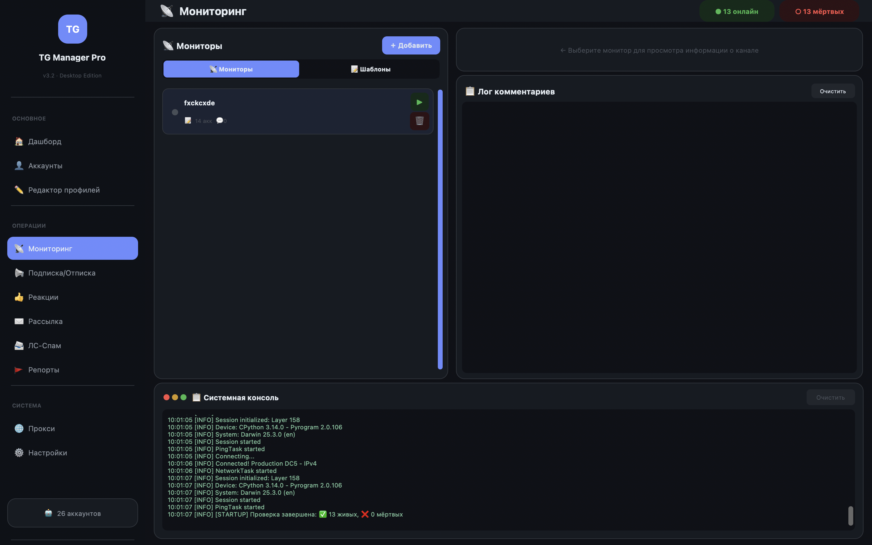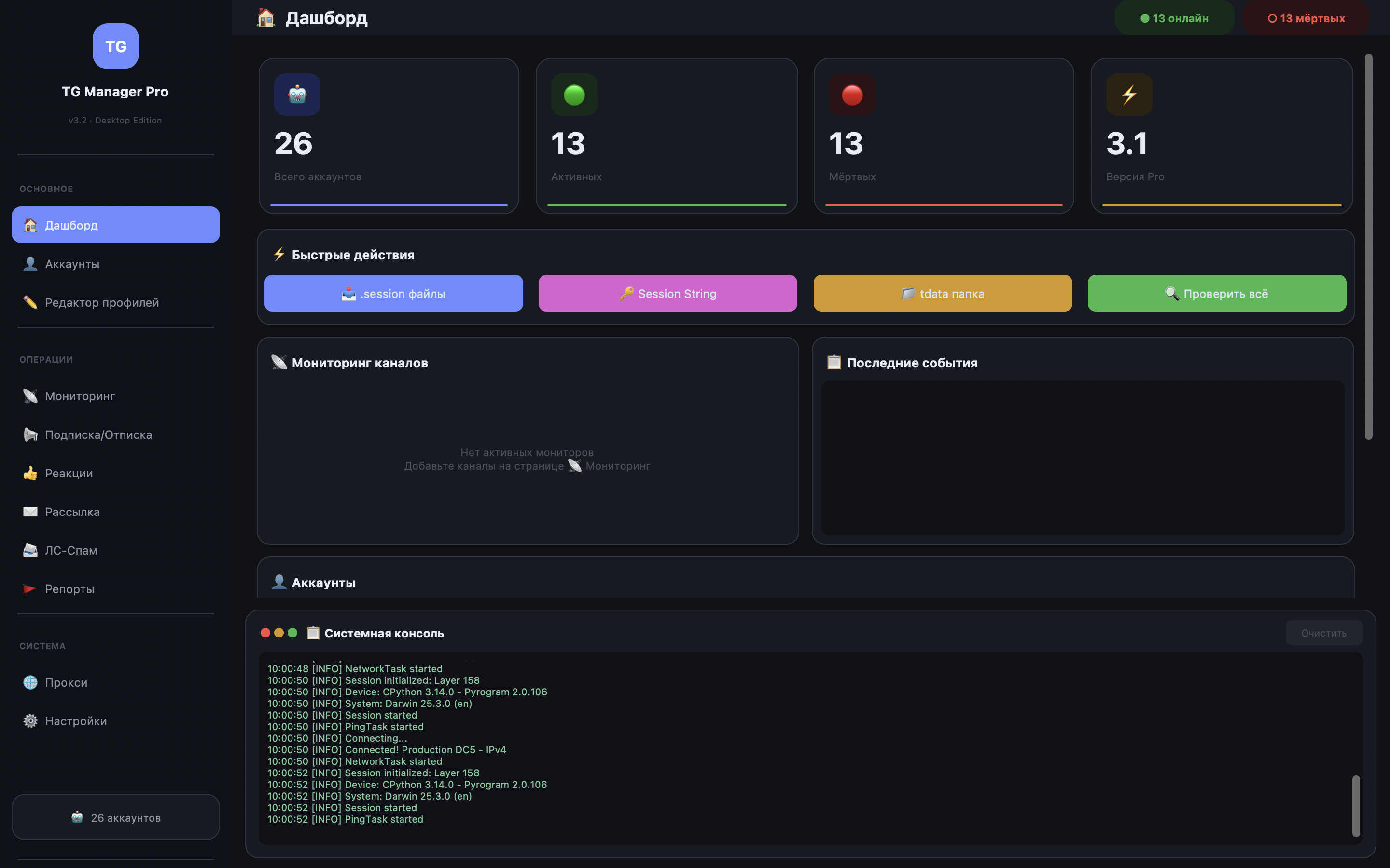 Управляй сотнями аккаунтов в одном окне — подписки, реакции, мониторинг каналов, авто-комментинг через AI, рассылки и многое другое.