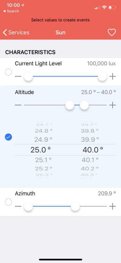 To use the Altitude and Azimuth characteristics, you will need an app such as Matthias Hochgatterer's Home - Smart Home Automation app. Using this app you can see the current position of the sun, and create automations based on it: