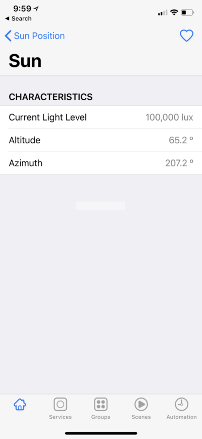 A single "Sun" accessory is added to your home, represented as a Light Sensor; the lux values are somewhat arbitrary and are based on the current phase of the day. HomeKit requires a recognized service for automation, and this seemed like the closest thing.