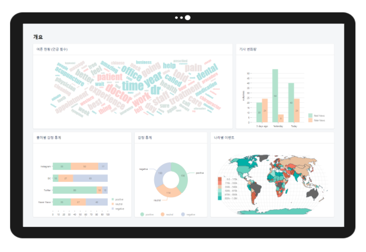 여론 현황: 각종 기사글, 게시판 등의 커뮤니티 사이트들을 기반으로 언급 비중이 놓은 단어들을 보여주는 워드 클라우드입니다.출처별 감정 통계: 각종 SNS 및 커뮤니티 사이트들을 기반으로 여론의 감정 상태를 분석하여 positive, neutral, negative로 나누어서 표현한 막대 차트입니다.통합 감정 통계: 각종 기사글, 게시판 등의 커뮤니티 사이트들을 기반으로 여론의 감정 상태를 요약하여 보여주는 파이 차트입니다.기사 변화량: 오늘과 근 3일간의 기사량을 비교하여 시각화한 막대 차트입니다.나라별 이벤트: 100개 이상의 기사 및 전자 신문들을 기반으로 나라별 사건 발생도를 시각화 시킨 맵 차트입니다.