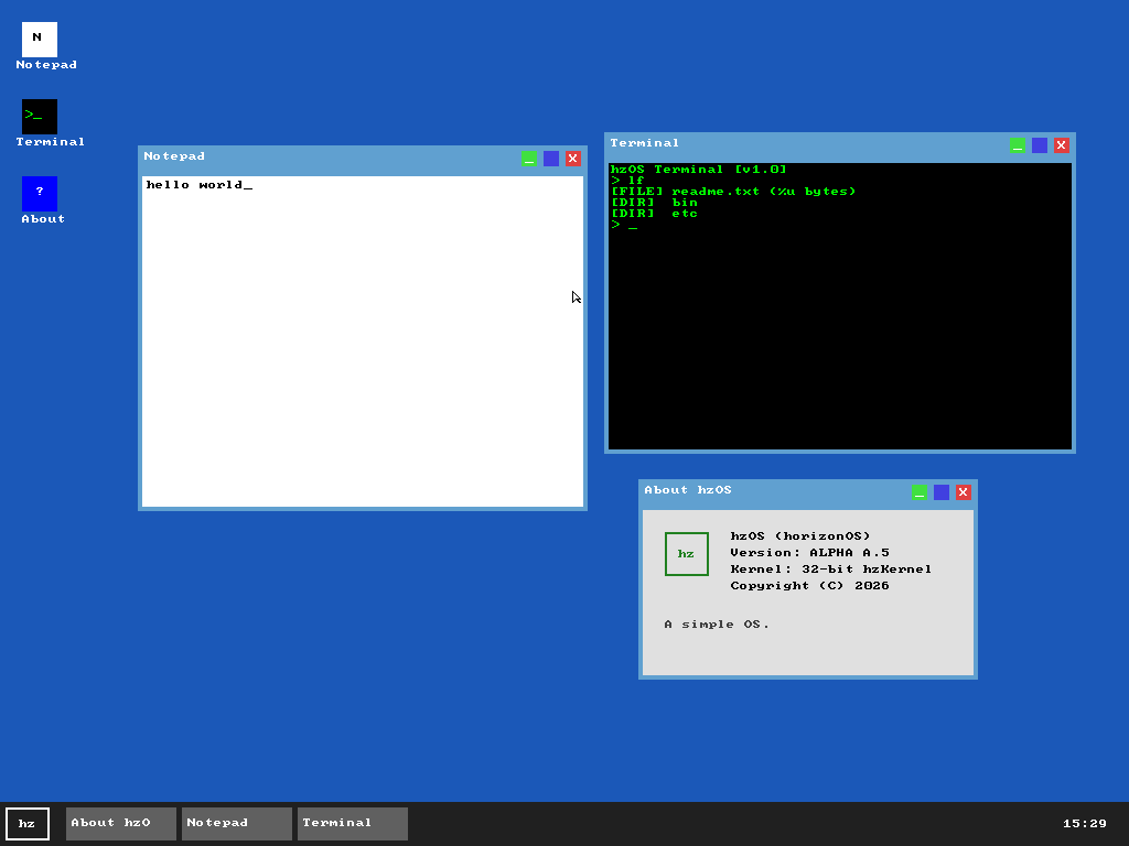 sudo apt install qemu-system-x86 qemu-utils build-essential nasm grub-pc-bin mtools xorrisogit clone https://github.com/horizon7006/hzOS.git