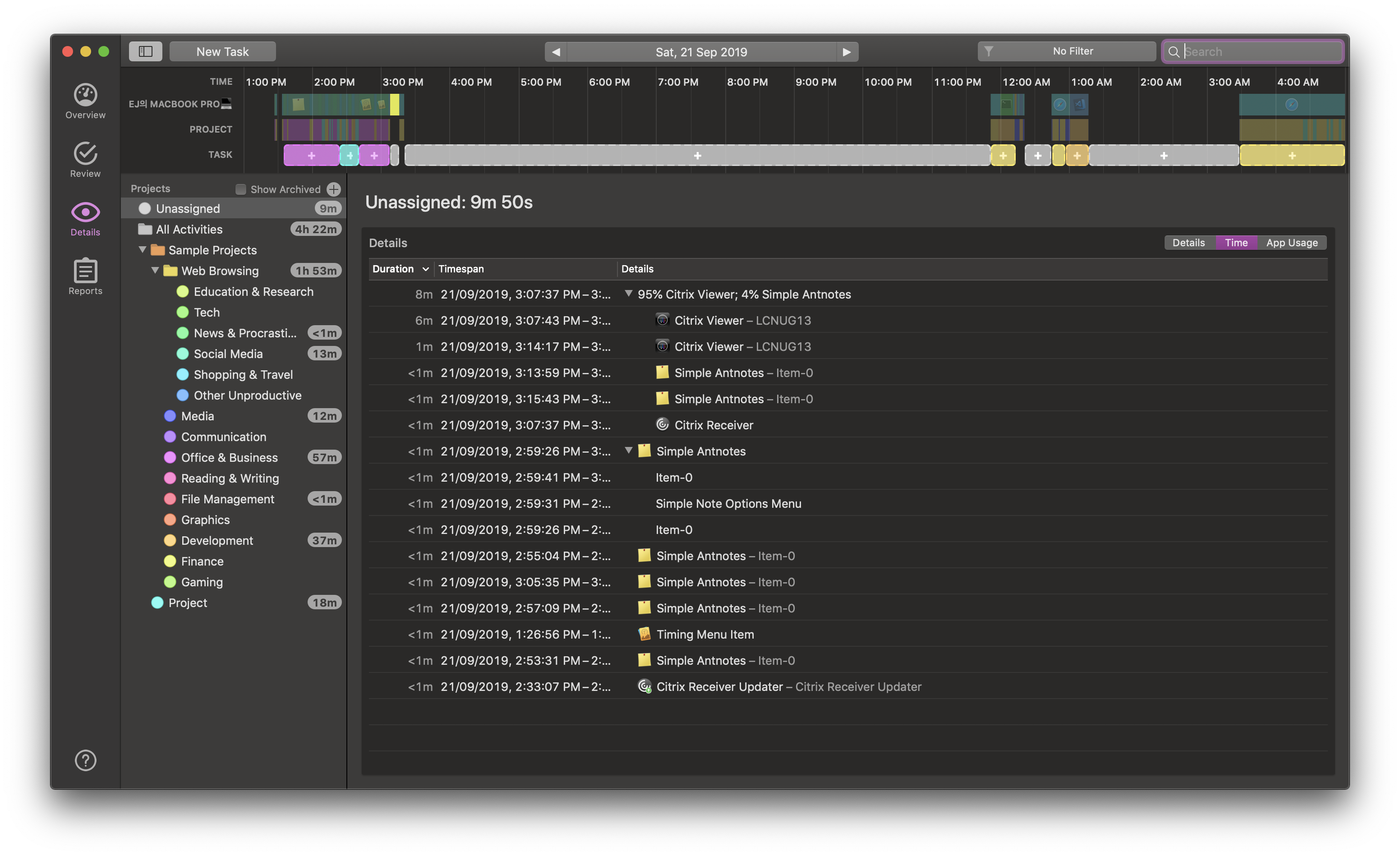기존 Timing내의 Detail page 기능 - details - time - app usage 변경된 TimeCat의 Detail page 기능 - time - duration - timespan - application name 각 row 들은 drag&drop 가능