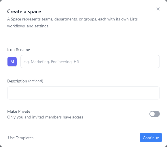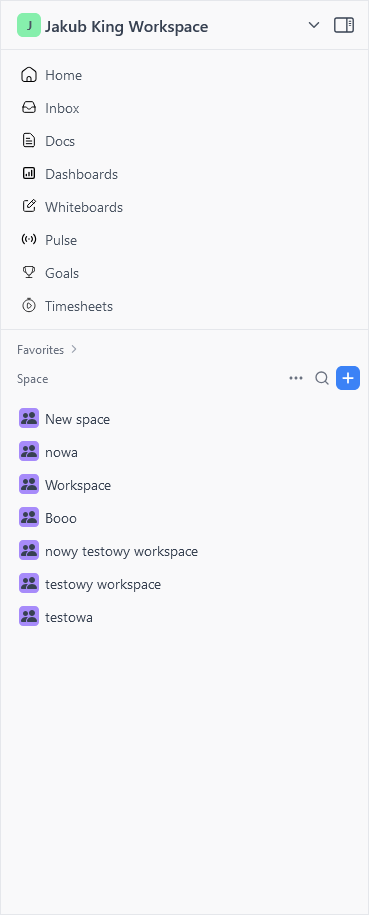 Workspace Workspace jest folderem przechowującym space z listami zawierającymi taski. Gdy dodawany jest space to wraz z nim umieszczany jest pierwszy domyślny List o nazwie "List".