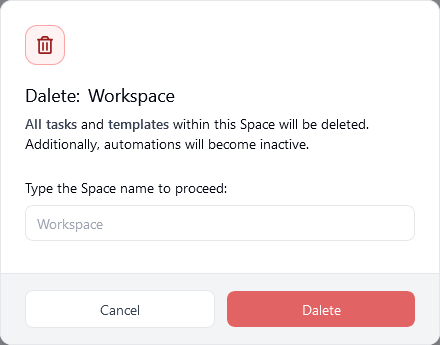W celu usunięcia workspace należy wpisać nazwe listy i zatwierdzić.