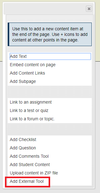 On our installation, you then need to go to "Add External Tool" and select PAOL LTI 2 in the next menu; however, on other installations, you may just select external tool under the general menu.
