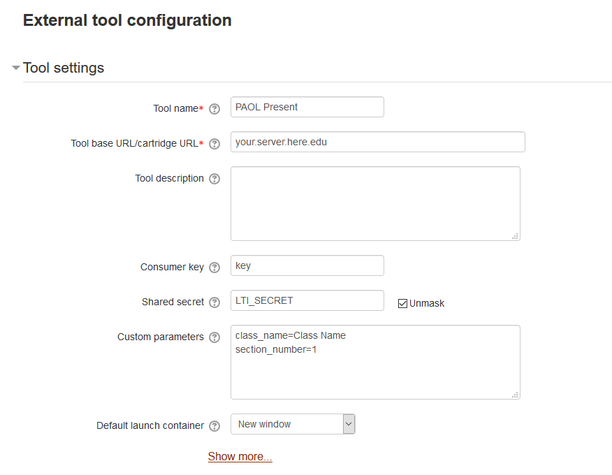 You then need to configure the launch URL with where you have Present deployed, in adition to the launch key value as key and the secret as whatever is in the .env for LTI_SECRET. Custom parameters may be added ensure proper syncing of classnames with capture.