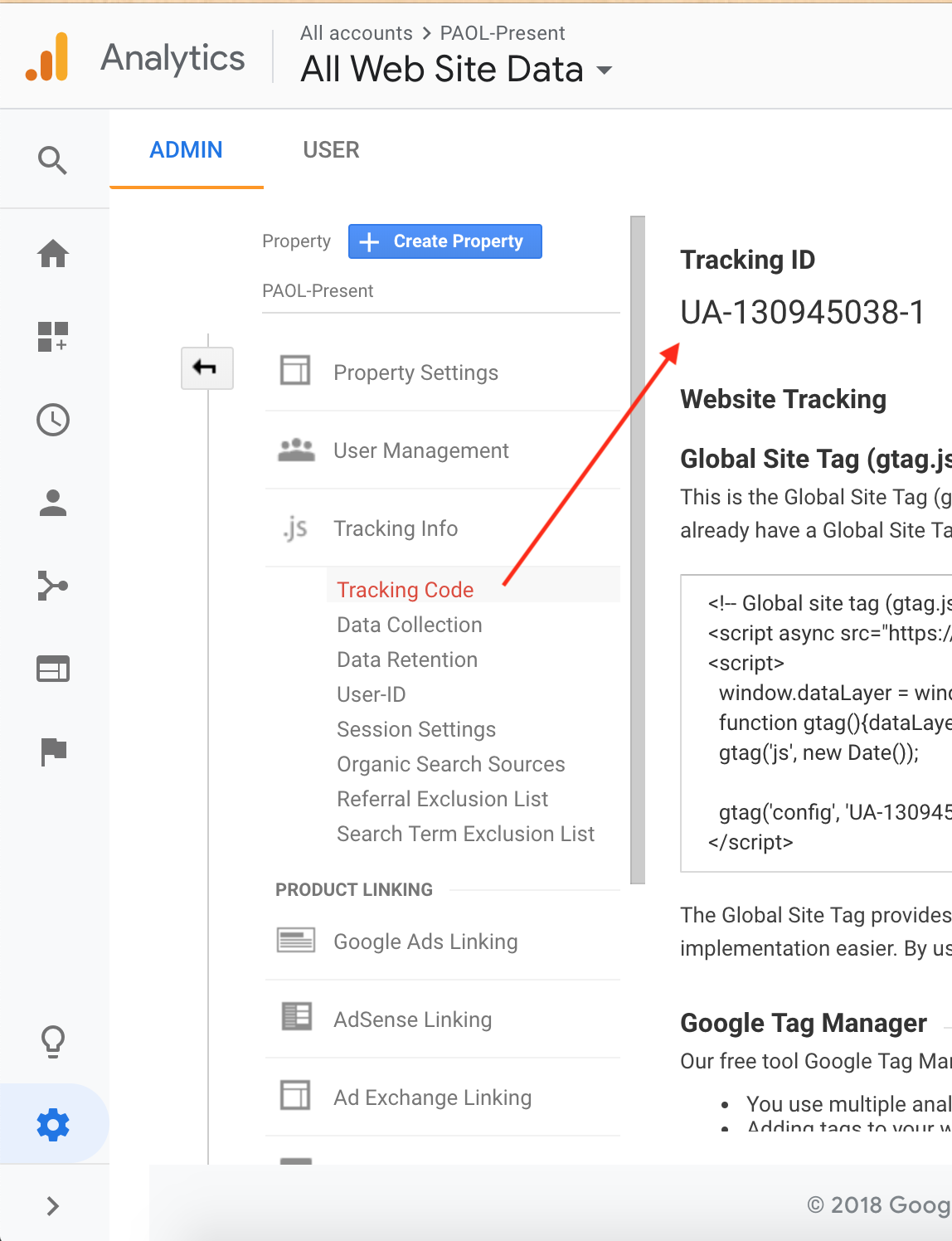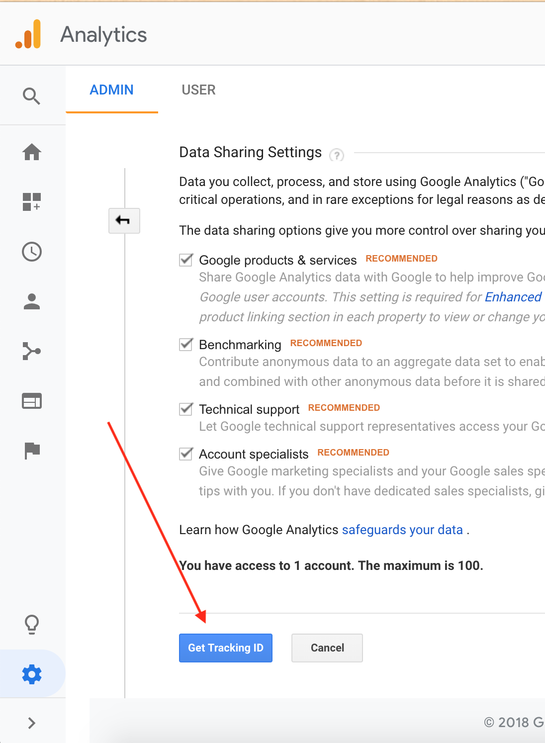 After you accept the terms and conditions you will be redirected to a page that has your site's tracking ID. This ID is very important so make sure you know how to get back to this information.