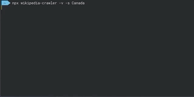 npx wikipedia-crawler start -v -s Canadaconst { wikipediaCrawler } = require("wikipedia-crawler");