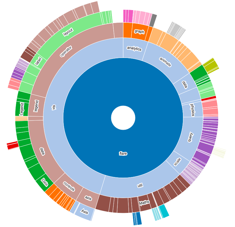 Clicking on an arc focuses the view on the associated sub-tree, enabling a gradual exploration of the data. Clicking in the chart's center zooms out one level, while clicking on the canvas resets the zoom level to the root view. The chart also responds to data changes by animating the arcs of each of the nodes into their new positions.